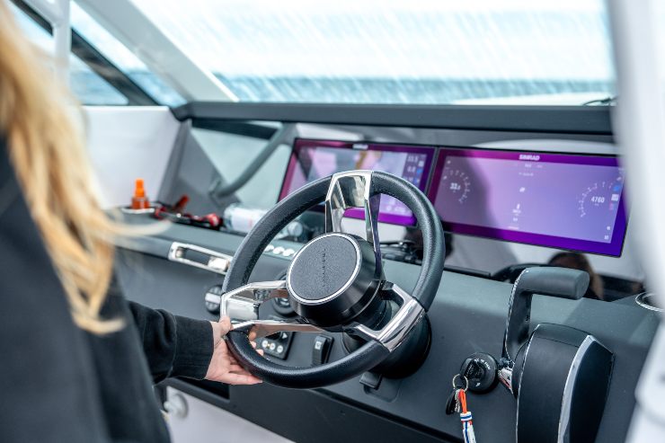 La postazione di guida è stata progettata secondo rigorosi criteri ergonomici: l’angolo del volante, la posizione delle leve di comando, la visibilità degli strumenti e la protezione aerodinamica del parabrezza concorrono a ridurre affaticamento e stress del comandante, soprattutto nelle lunghe navigazioni a velocità sostenuta. Il parabrezza avvolgente e i tergicristalli integrati assicurano una buona visibilità anche con pioggia o spray.