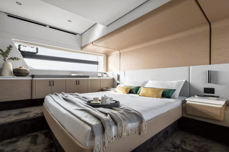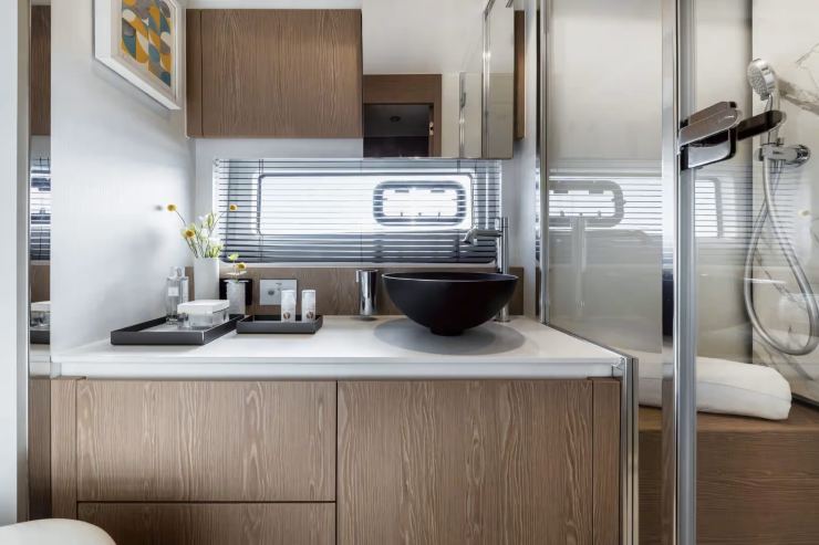 Le finiture superficiali seguono gli standard tipici del cantiere: gelcoat ad alta resistenza agli UV, verniciature metallizzate opzionali sullo scafo, teak su pozzetto, plancetta e parte del flybridge. Internamente, l’uso combinato di legni a poro aperto, laccature opache e dettagli metallici satinati crea un ambiente contemporaneo ma caldo, pensato per l’utilizzo intensivo e stagioni lunghe a bordo.
