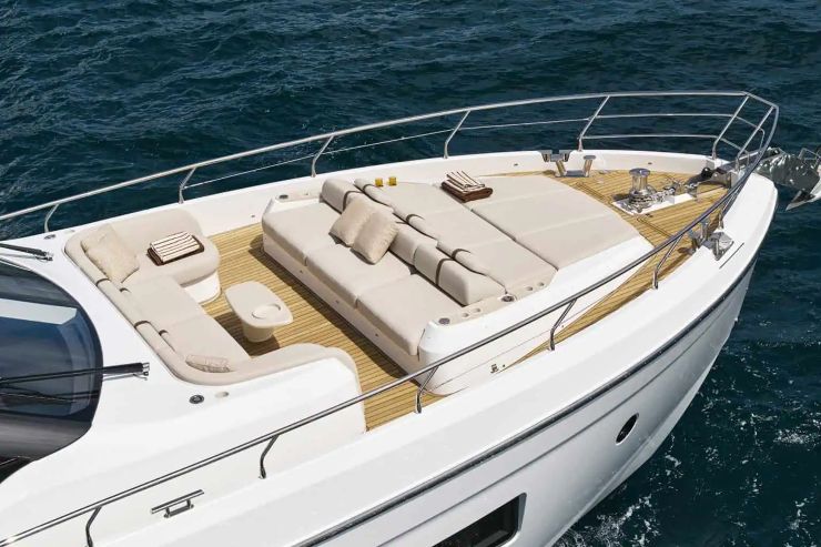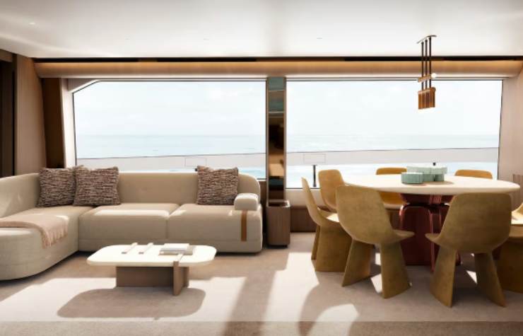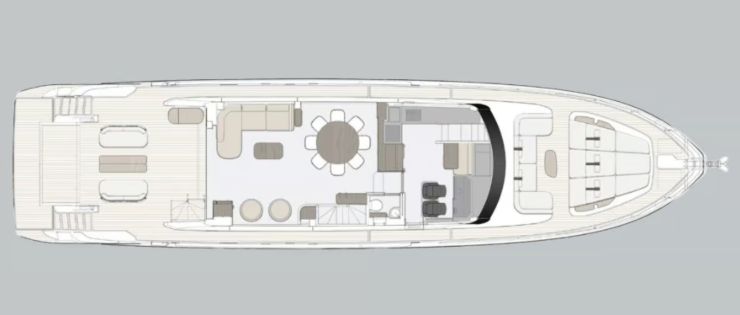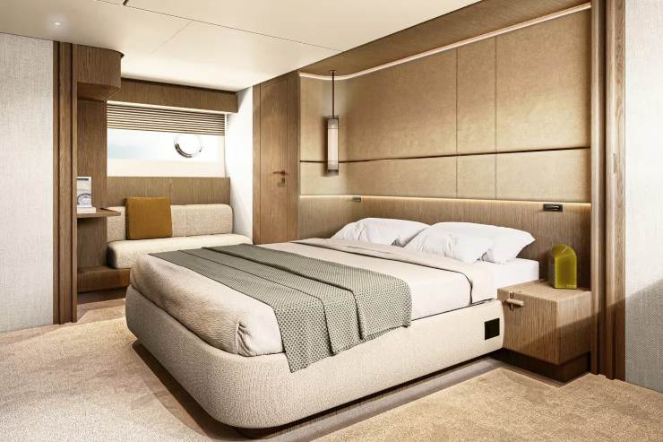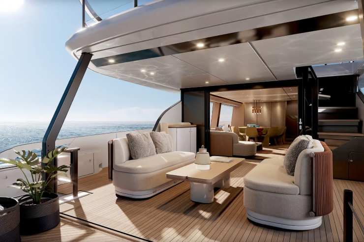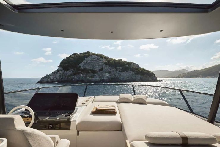 Il beach club/spiaggetta di poppa è dimensionato per water toys e tender; il pozzetto ospita una dinette riparata, mentre il fly distribuisce living, timoneria e aree prendisole. Prua sfrutta il baglio per una lounge “a conchiglia”, utile in rada.