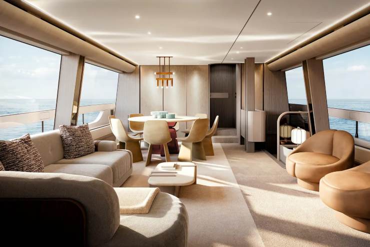 Linee filanti, superfici vetrate estese e flybridge strutturato su tre aree principali (zona prendisole/relax, dinette con wet-bar/galley esterna, timoneria), con passavanti ampi e pulpiti rastremati. I volumi del main deck sono organizzati per un salone traversante luminoso, mentre la cabina armatoriale in lower deck sfrutta l’ampiezza al baglio massimo.