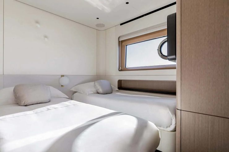 La cabina armatore occupa tutta la larghezza dello scafo, con vetrate panoramiche che annullano il confine con l’esterno. Letto centrale king-size, zona vanity/desk su un lato, divanetto o chaise longue sull’altro, armadiature a tutta altezza e un’area bagno avanzata, spesso concepita come ambiente passante con doppio lavabo, grande box doccia e toilette separata.