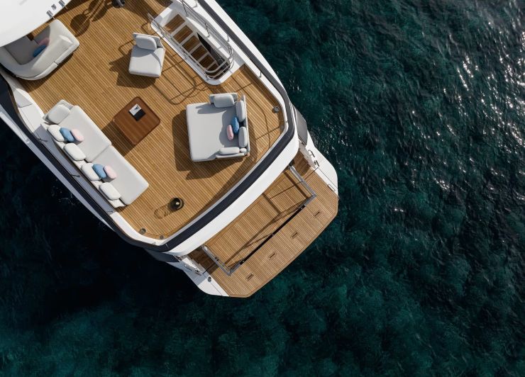 Elemento distintivo è la poppa con sistema Deck2Deck™: il portellone di specchio di poppa si ribalta fino a portarsi a filo con il ponte principale, trasformando il tradizionale pozzetto in una grande terrazza sul mare. Il tavolo centrale diventa un’isola walkaround accessibile su quattro lati, mentre le sedute perimetrali e la continuità visiva con il salone amplificano la percezione di uno spazio unico “inside-out”.