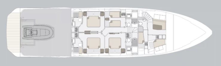 Con un baglio massimo di circa 6,30 metri e una stazza interna intorno ai 130 GT, il Grande 26M si posiziona nella fascia degli 85 piedi, ma con una fruibilità di bordo tipica di unità di dimensioni superiori: Maxi Fly a tutto baglio, poppa trasformabile con la terrazza Deck2Deck™, suite armatoriale sul ponte principale e ben cinque cabine ospiti per un totale di 10–11 persone, servite da un’area equipaggio dedicata.