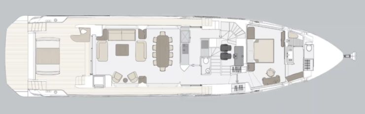 - Una beach area a livello dell’acqua, fruibile una volta aperto lo specchio di poppa, con spazio per sdraio, accesso diretto al mare e varo del tender.