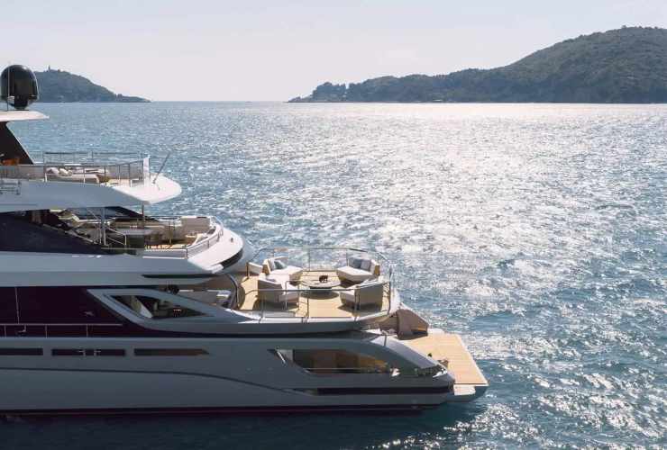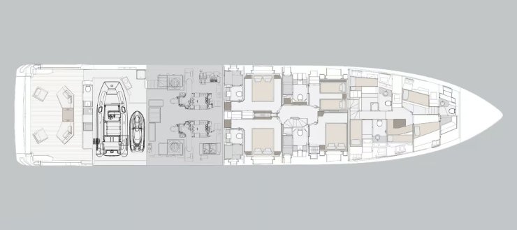 La carena adotta un deadrise variabile con volumi prodieri importanti, studiati per incrementare portanza sull’onda e mitigare gli impatti. La sezione maestra è calibrata per minimizzare le resistenze viscose a regimi di crociera, mentre la geometria del pattino e la linea di chiglia sono rifinite per ridurre cavitazione e scie di pressione a vantaggio dell’efficienza dell’elica. L’impostazione a tre ponti è completata dalla logica “sea-terrace” a poppa: una sequenza di piattaforme sfalsate che crea un gradiente spaziale dal beach club al sun deck attraverso zone lounge intermedie.