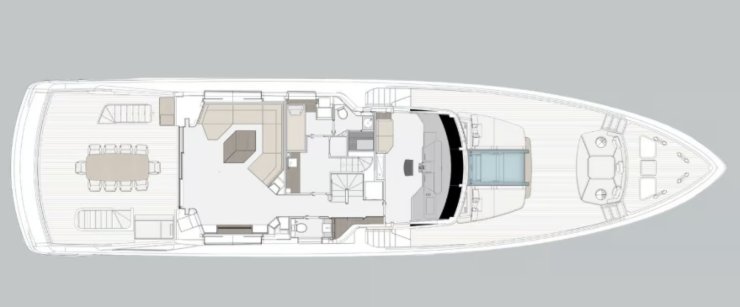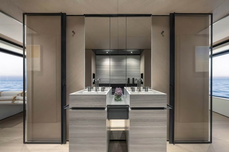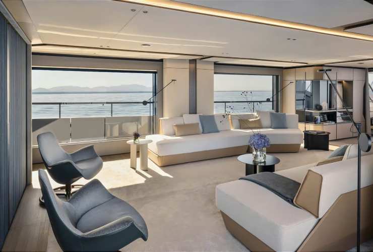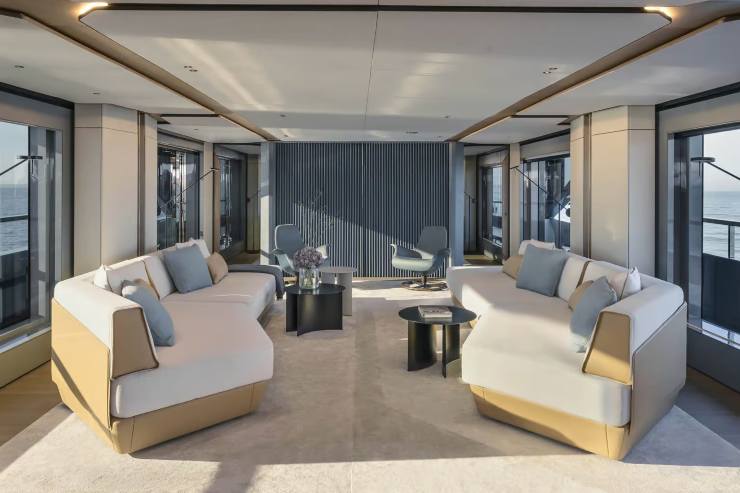 L’architettura del Trideck è il risultato di una regia che fonde linee tese e superfici vetrate a tutta altezza con interni luminosi e permeabili al paesaggio. La scomposizione a terrazze consente di separare naturalmente il guest flow dal service flow, tutelando privacy e puntualità del servizio. Il layout tipico prevede un salone principale con aperture scorrevoli a tutta luce, zona pranzo con tavolo per il servizio completo e un collegamento fluido alle aree esterne di poppa. La suite armatoriale, in posizione che minimizza sollecitazioni e rumori, adotta finestrature panoramiche, bagno in en suite e vano guardaroba di dimensioni residenziali.