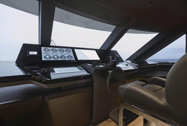 La filosofia propulsiva del Grande Trideck privilegia l’affidabilità e la prevedibilità di risposta. I gruppi termici diesel di grande cubatura adottano iniezione elettronica di ultima generazione e gestione termica ottimizzata, con curve di coppia piene ai medi regimi per sostenere crociere lunghe con carichi variabili. La trasmissione su linee d’asse, abbinata a eliche meticolosamente calettate, privilegia l’efficienza globale e la semplicità manutentiva; la geometria delle prese a mare, dei tunnel e delle condotte è progettata per ridurre perdite di carico e rumorosità indotta. A richiesta sono disponibili thruster proporzionali e joystick di manovra integrati con i controlli motori, per una “regia” unificata nelle fasi di ormeggio.