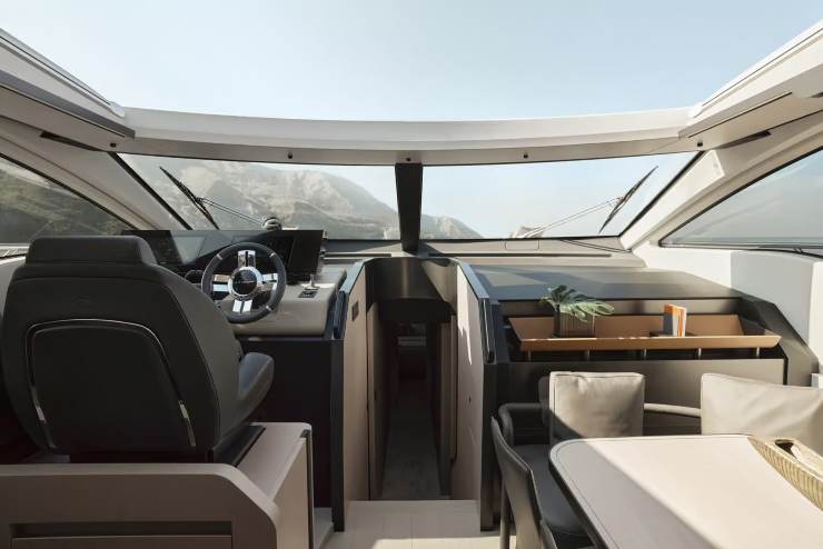 Il comportamento evidenziato dalle prove è coerente con l’impostazione: inserimento progressivo in virata, assetto piatto ben controllato dagli interceptor e risposta pronta del joystick in manovra. A regime, la barca trasmette l’idea di “sportiva matura”: reattiva ma mai nervosa, con un feedback al timone filtrato il giusto per non affaticare il driver su trasferimenti lunghi.