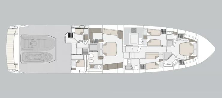 Il lower deck propone 4 cabine con 4 bagni en-suite: armatoriale full-beam a centro barca (zona di minimo moto), VIP prodiera e due ospiti laterali (singole convertibili o twin). L’equipaggio dispone di alloggio separato a poppa. La palette di interni firmata Francesco Guida alterna essenze chiare e tessili tecnici, con due direzioni estetiche diffuse sui modelli: una più Platinum, l’altra più scura (Black Pearl), a seconda delle collezioni.