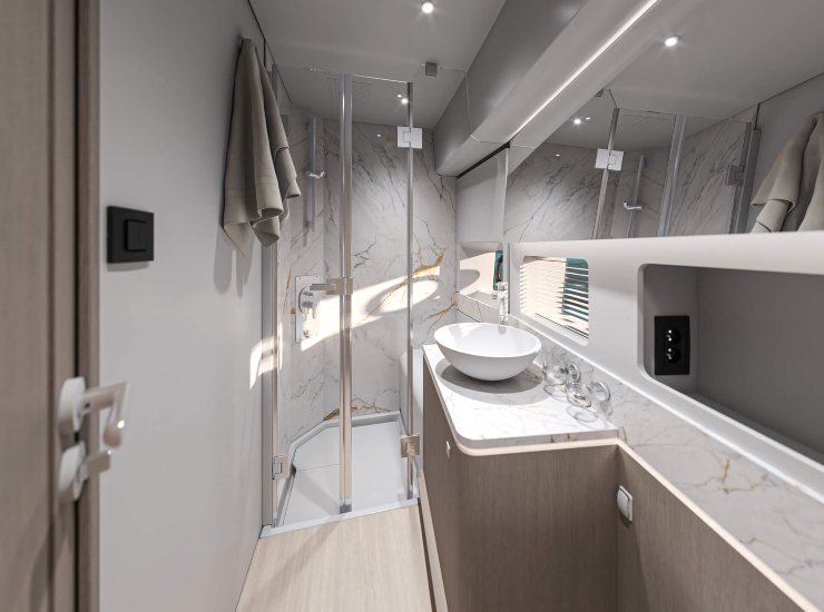 Sottocoperta, la barca offre una configurazione a 2 cabine (con area lounge aggiuntiva) oppure a 3 cabine, mantenendo l’elemento più “da yacht” del progetto: una suite armatoriale a tutto baglio a centro barca, con servizi dedicati e stivaggi impostati in modo quasi “dressing room”. È un punto cruciale perché, nel segmento 50 piedi, la suite full-beam non è solo comfort: è un indicatore di maturità progettuale, dato che richiede un’ottima gestione delle strutture, delle finestrature e della distribuzione impiantistica.