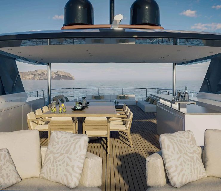 La zona di poppa integra il beach club con accessi acqua sicuri e spazio per tender e water toys. Il ponte superiore offre al fresco dining con affacci panoramici, mentre il sun deck è pensato come piattaforma trasformabile per relax, fitness e intrattenimento serale. La rete AV/IT esterna permette proiezioni, musica e connettività senza interferire con i sistemi di bordo.