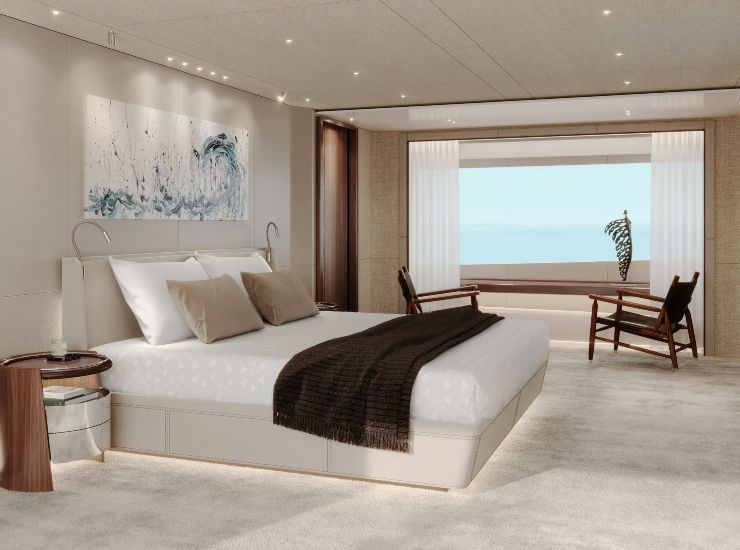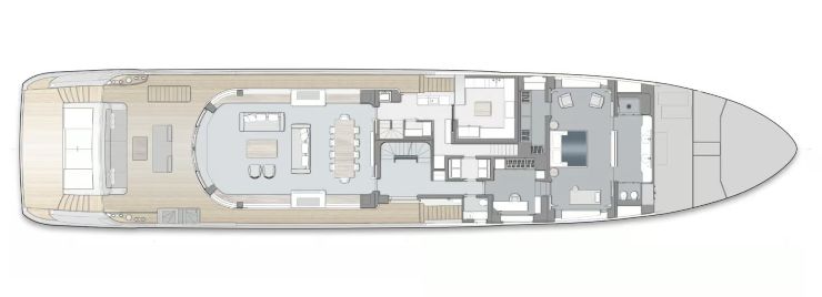 - Ponte principale: salone panoramico, pantry di servizio, cucina professionale, day-head; suite armatoriale full-beam a prua con studio, cabina armadio e bagno di rappresentanza.