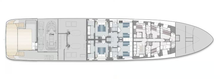 - Ponte inferiore: quattro cabine ospiti (VIP + doppie convertibili), locale lavanderia, area equipaggio con accessi separati, beach area e locali tecnici di poppa.