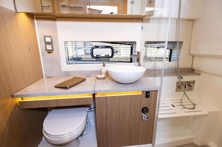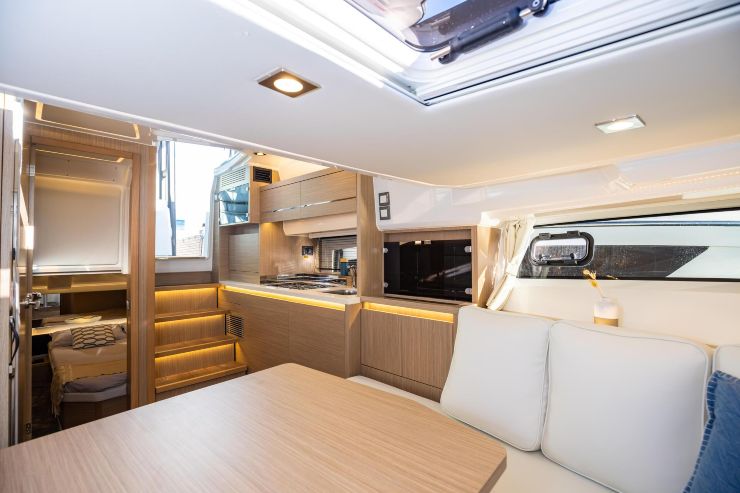 Sottocoperta, la cabina armatoriale a poppa include un matrimoniale vero affiancato da una cuccetta singola che, unita, forma un king-size; a centro barca troviamo un quadrato convertibile in ulteriore matrimoniale e, verso prua, un bagno con box doccia separato. L’illuminazione naturale è garantita da hull windows estese, mentre la ventilazione incrociata è assicurata da oblò e aperture sul cielo del T-top. L’ergonomia dell’insieme – passavanti larghi, tientibene continui, altezze utili – consente transiti sicuri con mare, rientrando nello spirito “walk-around” puro del progetto.