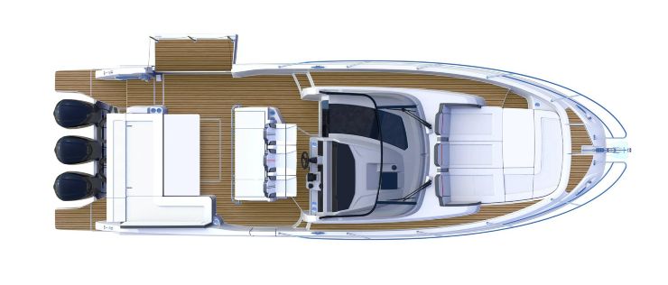 Il brief del progetto è chiaro: uno day cruiser ad alte prestazioni capace di ospitare una famiglia per il weekend, offrendo una cabina armatoriale vera, un quadrato convertibile e servizi completi, ma con la guidabilità e la prontezza tipiche dei fuoribordo. L’ergonomia di coperta privilegia la circolazione perimetrale e la fruibilità dei volumi all’aperto (pozzetto, prendisole prodiero, terrazza abbattibile), mentre sottocoperta troviamo altezze utili, letti di dimensioni domestiche e un bagno con box doccia separato: un equilibrio raro nei walk-around di questa classe.