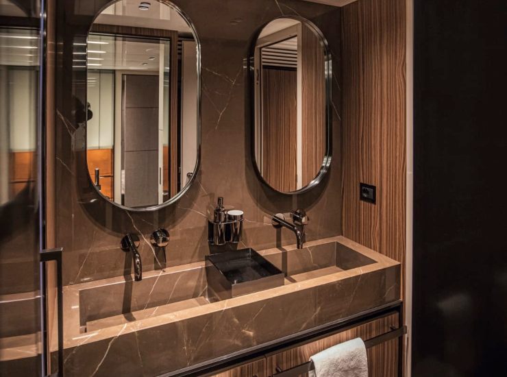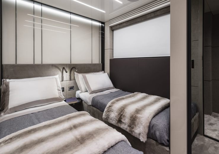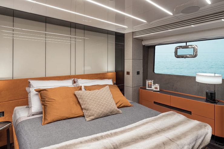 Sotto coperta, l’architettura tipica prevede quattro cabine con bagni dedicati, con master a centro barca (full-beam) come cuore dell’esperienza armatoriale. È una scelta non banale: la cabina armatore in posizione baricentrica è quella che beneficia maggiormente di riduzione beccheggio e comfort notturno. Le cabine ospiti (VIP a prua e due guest) sono pensate per non scendere a compromessi “da charter economico”: volumi, stivaggi e servizi sono dimensionati per permanenze reali.