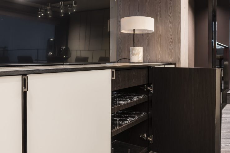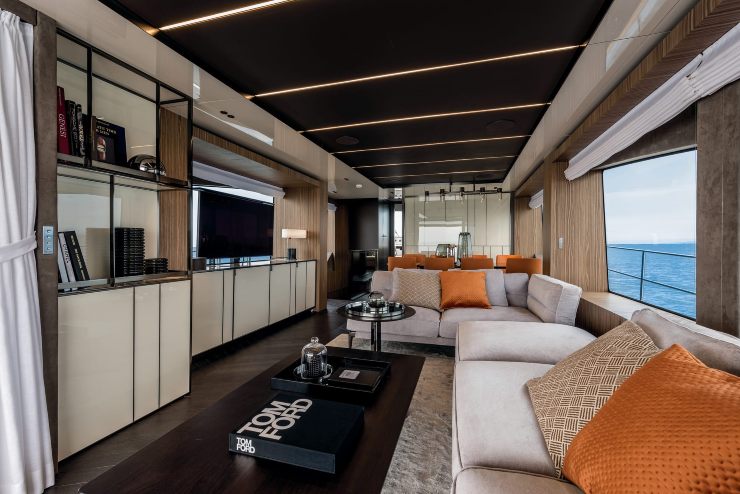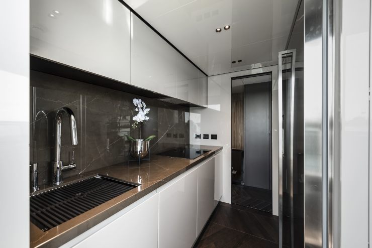 Il salone è impostato per offrire ampie superfici vetrate e un rapporto diretto con l’esterno. Qui si gioca una parte importante della percezione di qualità: l’ambiente deve essere luminoso, ma anche “composto”, con arredi e materiali che non temono l’uso quotidiano. La cucina sul main deck (in configurazioni tipiche) è pensata per servire sia l’armatore sia l’eventuale equipaggio, con logiche di servizio che limitano interferenze con la vita in salone.