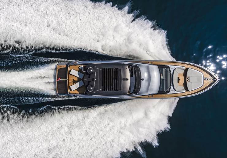 Le linee esterne sono volutamente pulite e senza spigoli marcati, con superfici continue che allungano otticamente la barca. Ma il vero punto è l’organizzazione: poppa, main deck e flybridge sono pensati come tre ambienti con identità distinta, collegati da percorsi chiari. La zona di poppa è progettata per diventare una “beach area” reale grazie alla piattaforma elettroidraulica e all’accesso al mare; sopra, il pozzetto lavora come living esterno protetto; il flybridge diventa il livello sociale per eccellenza, con area dining/aperitivo e prendisole.