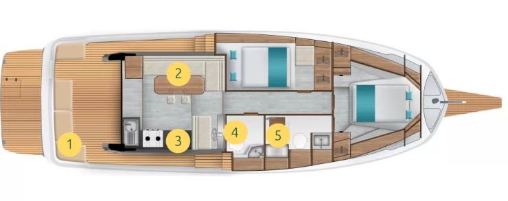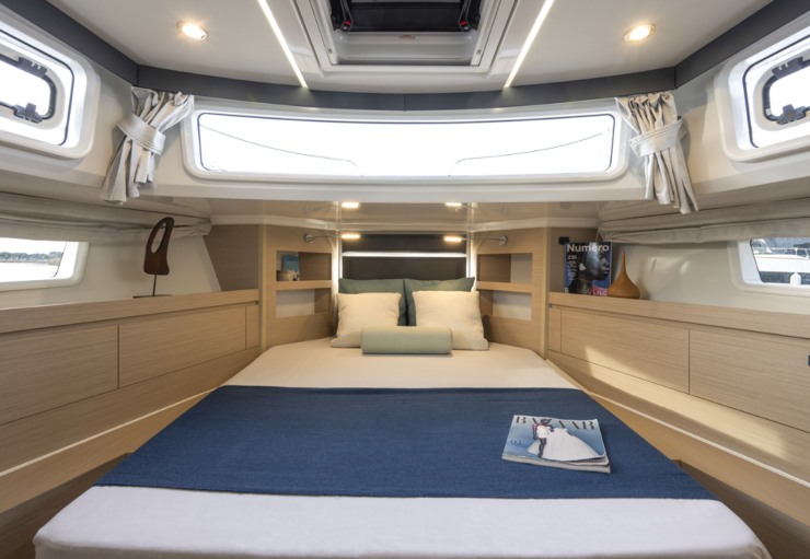 La barca offre due cabine e due bagni, una soluzione estremamente convincente per un dodici metri orientato alla crociera familiare. La cabina armatoriale prodiera beneficia di letto a isola, armadiatura e percezione volumetrica superiore alla media del segmento; la cabina ospiti, a murata, è ben sfruttata e adatta anche a una coppia adulta.