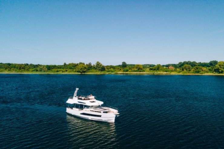 La lunghezza consente infatti di articolare un layout da vero family cruiser con due cabine e due servizi, mentre il baglio generoso permette di ottenere una sovrastruttura ampia, luminosa e sfruttabile senza ricorrere a soluzioni esasperate. Il pescaggio ridotto, a sua volta, apre il ventaglio operativo verso acque interne, approdi poco profondi e itinerari che sarebbero meno agevoli con scafi più immersi o con linee d’asse e appendici più profonde.