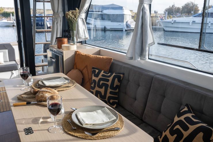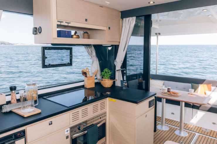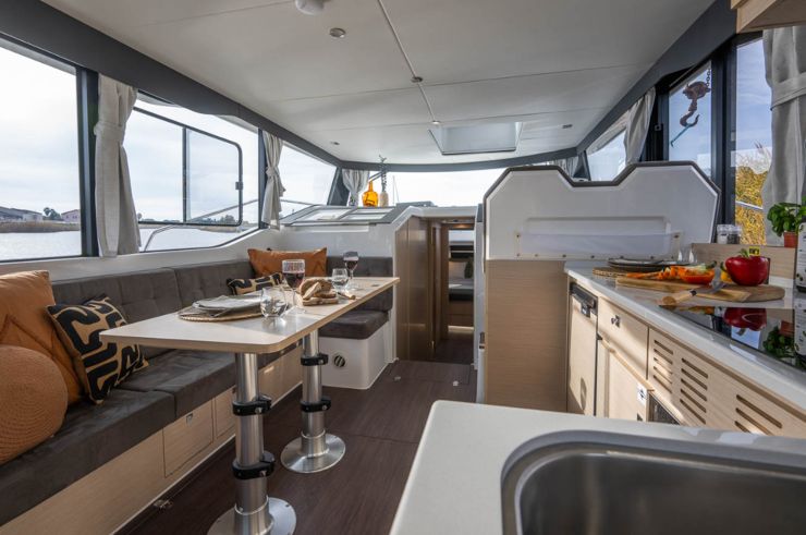 Il salone con divano a L, tavolo trasformabile e cucina completa sul ponte principale crea una continuità molto ben risolta fra area living e funzione di pilotaggio. Il risultato è uno spazio centrale che funziona davvero come cuore della barca: si governa, si cucina, si conversa, si vive. È qui che il Delphia 12 FlyLounge mostra la propria maturità progettuale.