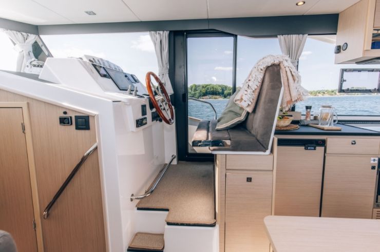 La timoneria interna è uno dei punti di forza funzionali del progetto: visibilità ben studiata, prossimità alla zona giorno, accesso rapido ai passavanti e un’impostazione quasi automobilistica nella relazione fra pilota e ambiente. Questo dettaglio fa la differenza nell’uso reale, soprattutto nelle lunghe giornate di trasferimento o nelle mezze stagioni.