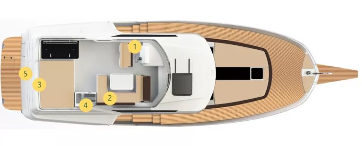 Il pacchetto elettronico prevede soluzioni di impostazione pratica, con possibilità di integrazione di autopilota Simrad, chartplotter, radar e sensore angolo timone, oltre a VHF e accessori per la postazione superiore. La presenza di una doppia stazione di comando, interna ed esterna, amplia la flessibilità operativa e rende la conduzione più confortevole a seconda di meteo, traffico e preferenze personali.