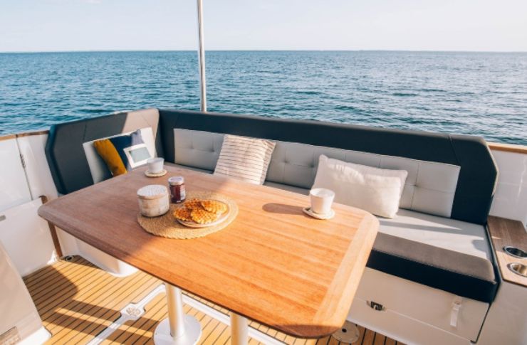 La composizione dei materiali è pensata per resistere a un uso intensivo: tessuti marini, superfici di lavoro in composito, mobili razionali, dettagli che privilegiano l’impiego reale. È una barca che comunica concretezza, e proprio per questo convince chi cerca comfort autentico più che lusso scenografico.