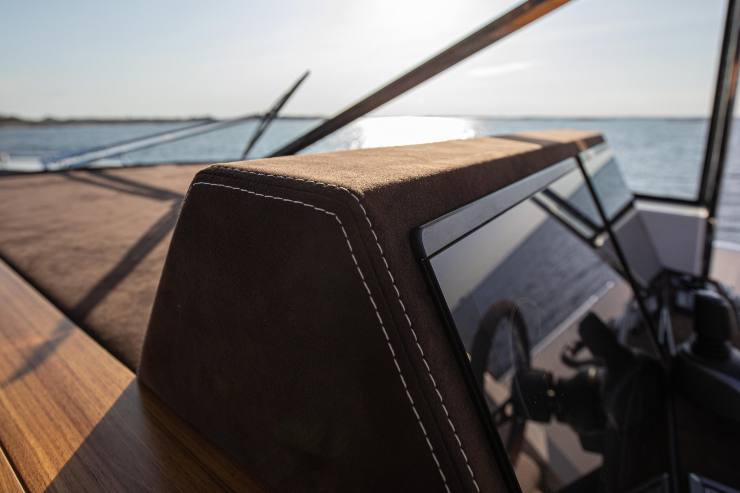 Le prove su mare aperto hanno evidenziato anche un tratto “da timoniere”: il 48 Coupé è silenzioso, filtrato e con ottima visibilità a 360° dalla postazione di guida, merito della timoneria centrale avanzata e delle ampie superfici vetrate.