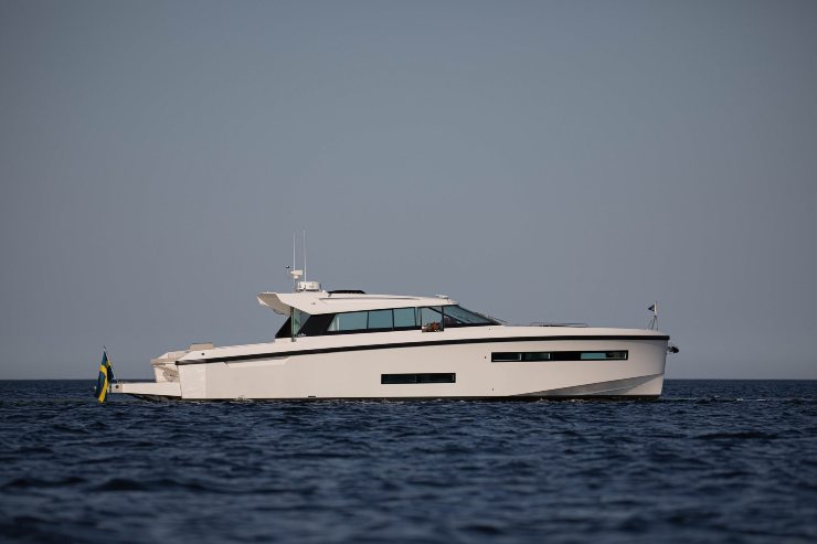 Fjord 44 Coupé offre un’impostazione “arc-saloon” vetrata con forte identità stilistica; top speed dichiarata ~36 kn con 2×Volvo IPS600, LOA 13,45 m. È un riferimento per chi privilegia design, modularità e facilità d’uso.