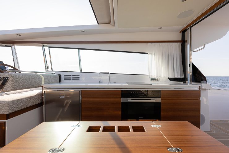 In coperta, il salone climatizzato è modulare: dinette trasformabile, cucina a isola lineare con piano attrezzato, porte scorrevoli verso il pozzetto e un grande tavolo telescopico di poppa per ampliare la zona lounge (soluzione elogiata nelle prove in mare).