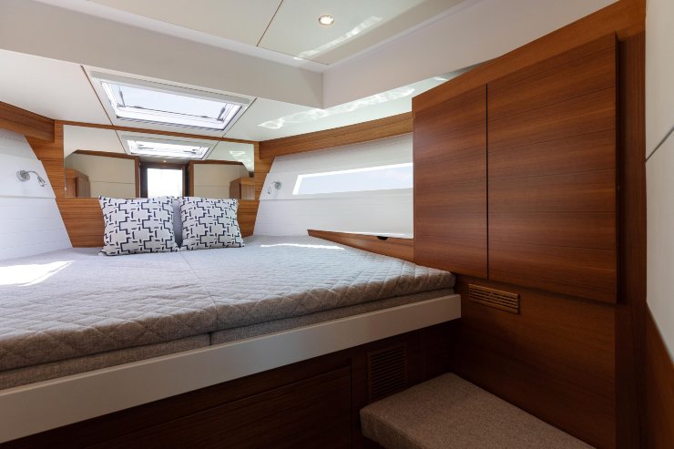 - Cabina armatoriale a prua con bagno dedicato, altezza utile e stivaggi ottimizzati.