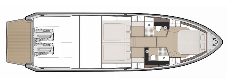 - Outboard Mercury Verado V12 600 (2×600 hp): soluzione ad alto rapporto peso/potenza, sterzo “steerable gearcase” integrato e two-speed transmission tipica del V12 Mercury, con guadagno in spinta ai bassi e rumorosità contenuta. Configurazione particolarmente indicata per mercati warm-water e per armatori che privilegiano semplicità d’accesso alla sala macchine (qui sostituita da gavoni tecnici).