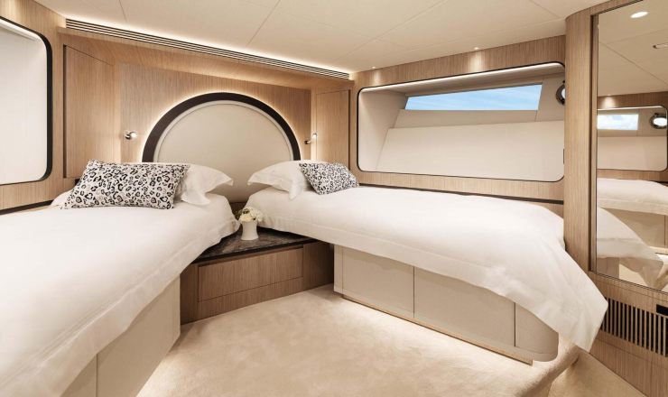La qualità percepita è alta: giunzioni pulite, falegnamerie su misura, insonorizzazione adeguata a un 80 piedi premium. L’illuminazione naturale è il vero protagonista: superfici vetrate a tutta altezza portano l’orizzonte “dentro casa”, mentre la Suite armatoriale — quando prevista sul main deck — beneficia di altezza utile e viste trasversali che raramente si incontrano a questa taglia.