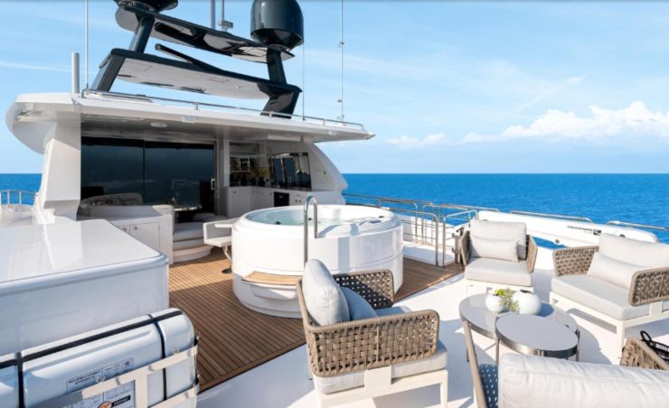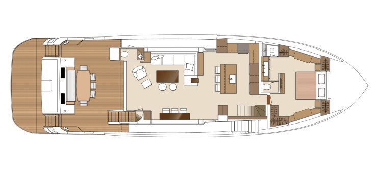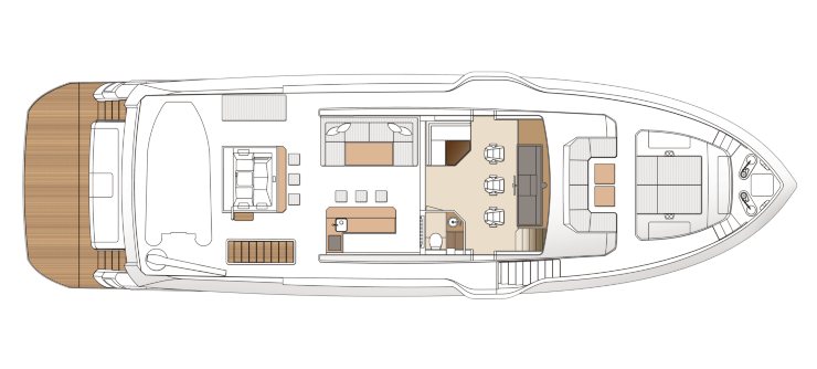 - Ponte superiore: in versione Split-use si ottiene una lounge conviviale con grill Teppanyaki, bancone bar e idromassaggio a prua della timoneria; in versione Skyline si privilegiano timoneria chiusa e privacy.