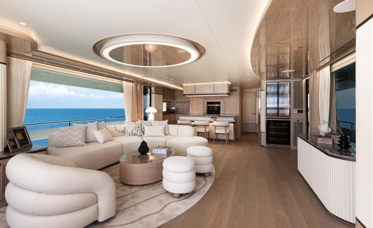 - Interni: boiserie personalizzabili in essenze selezionate (es. koto scuro), superfici materiche e tessili nautici ignifughi; pavimenti flottanti per isolamento acustico.