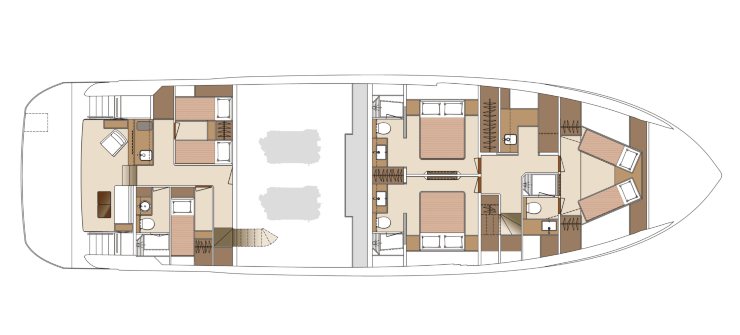 - Ponte inferiore: tre cabine ospiti (due VIP + twin convertibile), tutte con servizi en-suite; beach club/garage con finestra per luce naturale.
