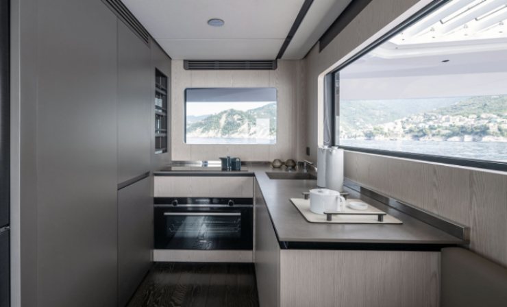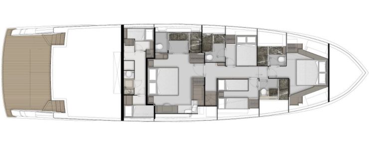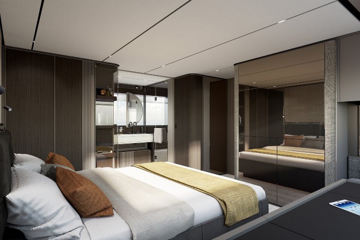 Il main deck è un open space che unisce salone, dining e – a richiesta – galley up o galley down. La cabina armatoriale a tutto baglio si colloca tipicamente a centrobarca nel lower deck per massimizzare la stabilità, con bagno en suite, vanity o studio, armadiature “walk-in” e ampie superfici verticali vetrate. Il layout standard prevede quattro cabine ospiti (VIP a prua e due guest laterali, tutte con bagno), più area equipaggio dedicata con accesso indipendente dalla poppa per preservare privacy e flussi.