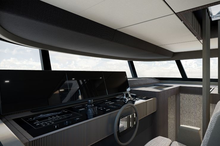 La timoneria è concepita come human–machine interface coerente: doppio (o triplo, a richiesta) display integrato multifunzione di grande formato, layout dei comandi per famiglie (navigazione, energia, ausili manovra), ridondanza dei canali critici, networking NMEA 2000/CAN-bus per sensori e attuatori. Radar a compressione d’impulsi, ecoscandaglio a doppia frequenza per l’analisi del fondale, autopilota con algoritmi adattivi e thermal camera per la navigazione notturna completano il quadro.