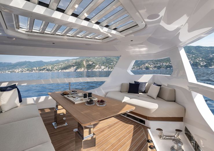 L’estetica dell’INFYNITO 80 è funzionale: grandi superfici vetrate a cintura continua abbassano la linea di orizzonte percepita dagli interni, mentre il parziale “enclosure” del ponte superiore definisce aree protette utilizzabili in stagioni estese. Prua abitabile con sedute e prendisole, beach area a poppa con piattaforma idraulica per tender e water toys, passavanti protetti e sovrastruttura alleggerita in carbonio creano un continuum fra ambienti coperti e spazi aperti, riducendo la “frizione” tra momenti di navigazione e vita in rada.