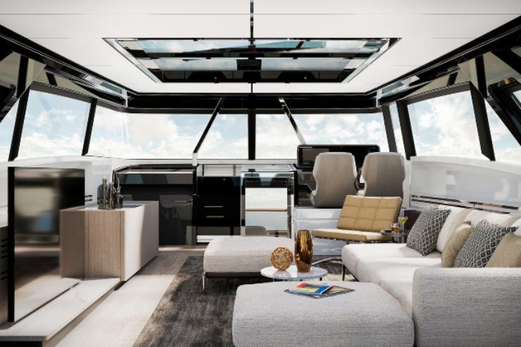 La peculiarità dell’edizione sta in tre elementi: la vetrata perimetrale integrale del ponte superiore che genera uno sky-lounge climatizzato; la porta scorrevole a tutta altezza che fonde salone chiuso e terrazza fly; e un tetto con lamelle apribili per modulare luce e ventilazione naturale. Il risultato è una veranda nautica capace di ampliare la stagionalità d’uso e di innalzare il livello di comfort acustico e termico durante crociere lunghe, trasferimenti veloci o permanenze in rada.