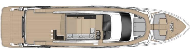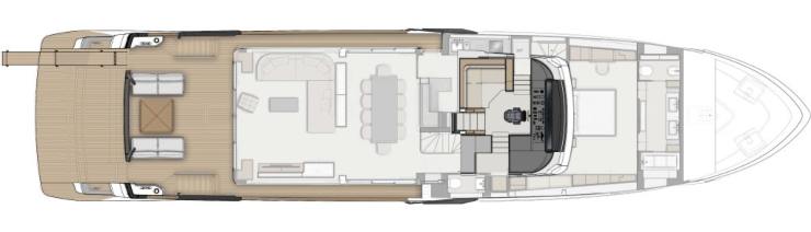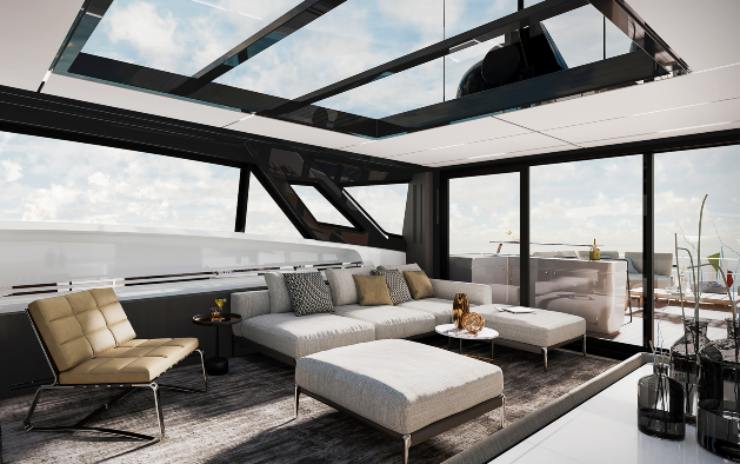 Il ponte superiore SkyDeck è il cuore della variante: uno sky-lounge vetrato che si apre sulla terrazza poppiera attraverso una sliding door full-height, con climatizzazione dedicata e possibilità di aerazione naturale attraverso lamelle apribili nel cielino. Questo consente di impostare lo spazio come family room, media room o observatory lounge in navigazione.