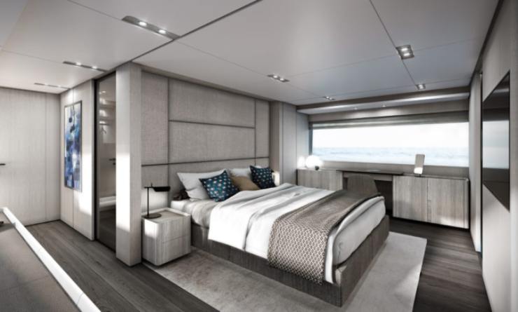 L’esperienza a bordo è costruita sui “fondamentali” della crociera mediterranea: cabina armatoriale sul main deck con bagni separati e guardaroba walk-in; quattro cabine ospiti tutte con servizi; sky-lounge vetrato riconfigurabile; terrazza di prua con doppi living e prendisole, beach area poppiera multi-livello con accesso facilitato al mare. L’ergonomia è marcata da corridoi larghi, altezze utili generose e una cucina “vera” – una delle più spaziose di categoria – che agevola sia l’uso armatoriale sia l’impiego charter.