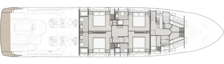 Sul lower deck trovano posto quattro cabine ospiti tutte con bagno en suite (due VIP e due twin convertibili a seconda dell’allestimento), e un’area equipaggio completa con accessi separati per massimizzare la privacy. Il cantiere propone due atmosfere interne, Classic (toni caldi) e Contemporary (palette più fresca e contrasti leggeri), applicabili uniformemente a tutti gli ambienti.