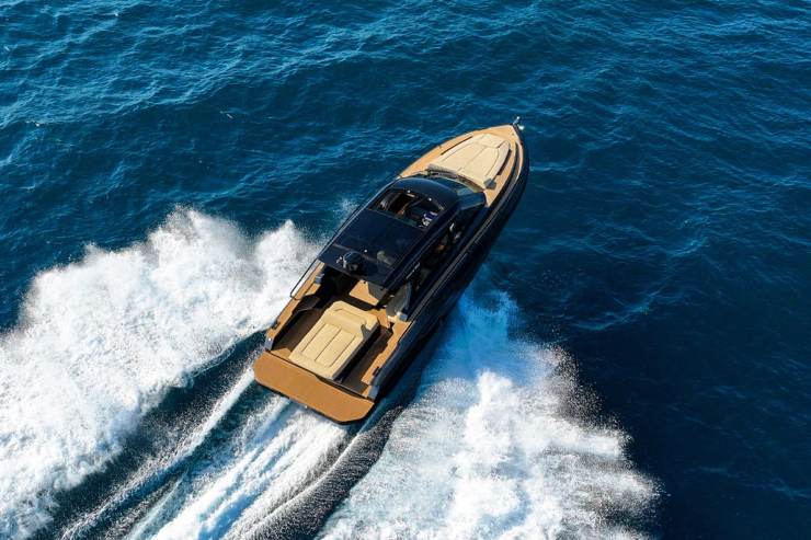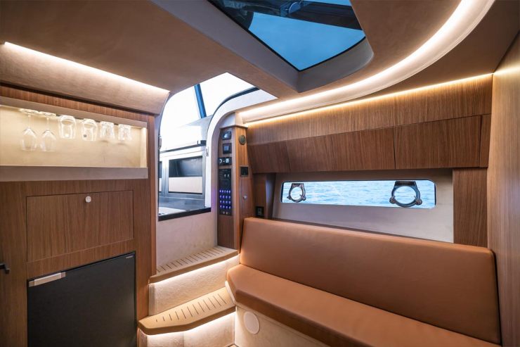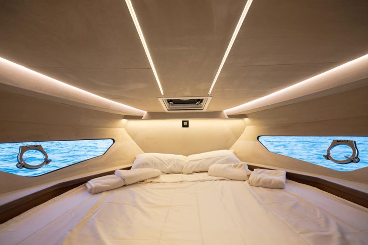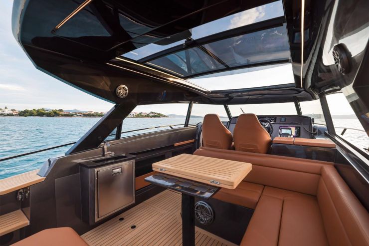 La combinazione sunpad di prua integrato, pozzetto modulare e piattaforma idraulica genera tre ambienti d’uso ben definiti. La possibilità di “aprire” le fiancate con le finestre elettriche rende l’area timoneria un salotto ventilato: un vantaggio concreto sulle tratte costiere estive. La capienza è di 10 ospiti in day-cruising e di 4 posti letto per weekend (fino a +2 temporanei in dinette).