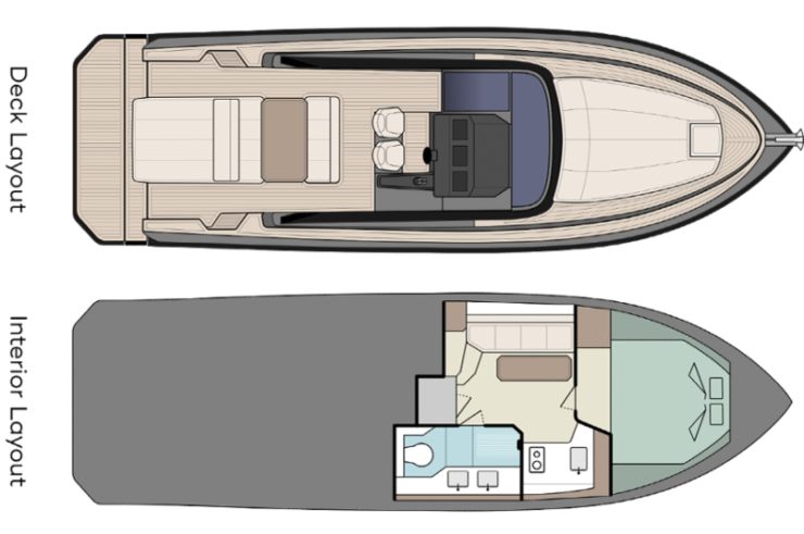 Il camminamento perimetrale (walkaround) su entrambi i lati e la tuga dalle curvature continue limitano la separazione dei filetti fluidi alle velocità di crociera, favorendo consumi più regolari e una spray line pulita. La prua con sunpad integrato a filo del ponte abbassa il baricentro visivo e reale, riducendo la resistenza aerodinamica (eolica) e migliorando la stabilità laterale nelle virate strette.
