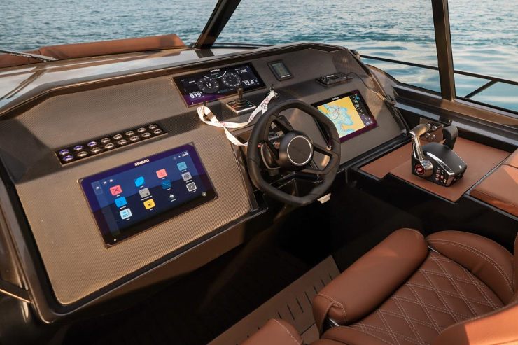 La seduta di guida centrale migliora la percezione della barca in accostata, con visibilità sulle poppe “aperta” e controllo visivo del clearance in banchina. Supportata da joystick e da sensori integrati (angolo di timone, trim, giri), la postazione evita over-steering in ingressi porto e riduce la fatica del comandante nelle manovre ripetute charter.