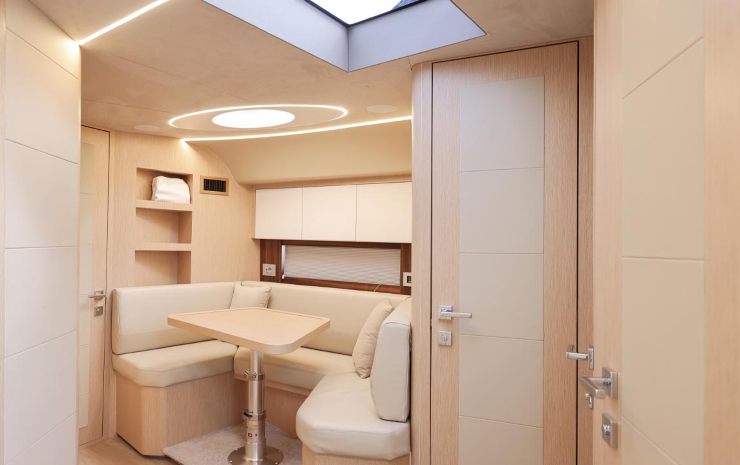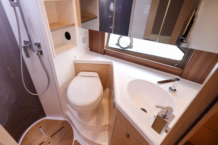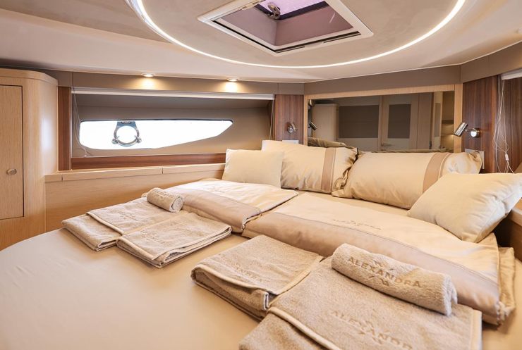 La climatizzazione canalizzata, i pannelli fonoassorbenti in sala macchine e i piedini antivibranti dei motori concorrono a ridurre rumori e risonanze. L’illuminotecnica combina LED indiretti per un’atmosfera calda con punti luce diretti sulle aree di lavoro. Sellerie e tessuti, resistenti ai raggi UV e alla salsedine, sono coordinati con le essenze del mobilio per un’estetica coerente. Numerosi vani di stivaggio, gavoni ventilati e spazi tecnici accessibili semplificano la vita dell’armatore che naviga spesso e porta molte attrezzature con sé.