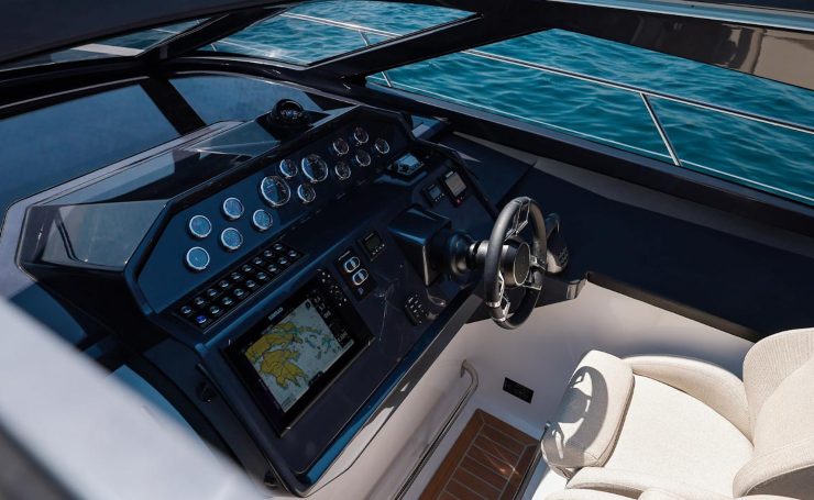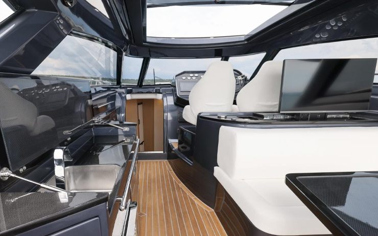 Il passaggio timoneria-pozzetto-plancetta è lineare, con soglie ridotte e porte scorrevoli; le maniglie sono dove ci si aspetta, gli scalini hanno alzate e pedate regolari. Le sedute timoniere presentano regolazioni multiple e braccioli funzionali; pedaliera e ruota sono allineate per una postura naturale anche in conduzione prolungata. La visibilità in accosto è coadiuvata da telecamera di poppa e, in presenza di pod, da joystick integrato.