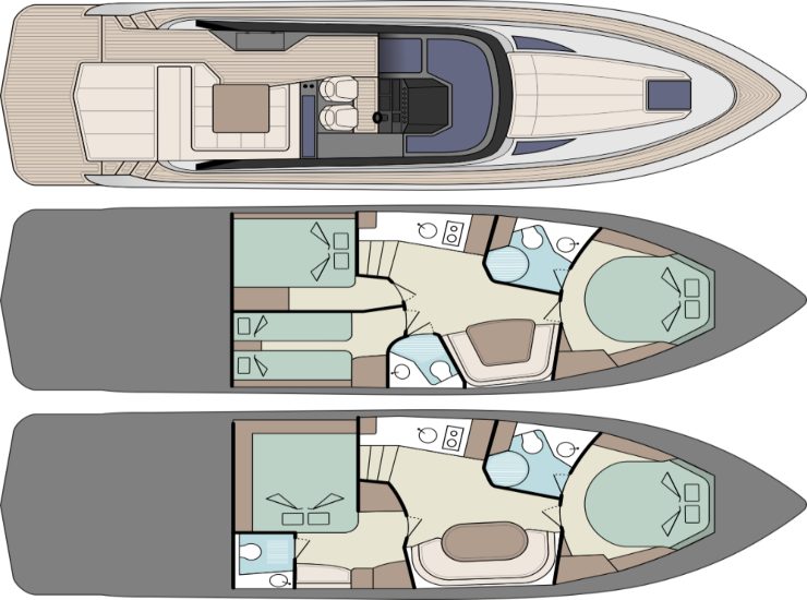 - Princess V40/V45: iconici per equilibrio generale; il Focus 44 propone un pacchetto prestazionale incisivo e una grande attenzione all’ergonomia di plancia e pozzetto.